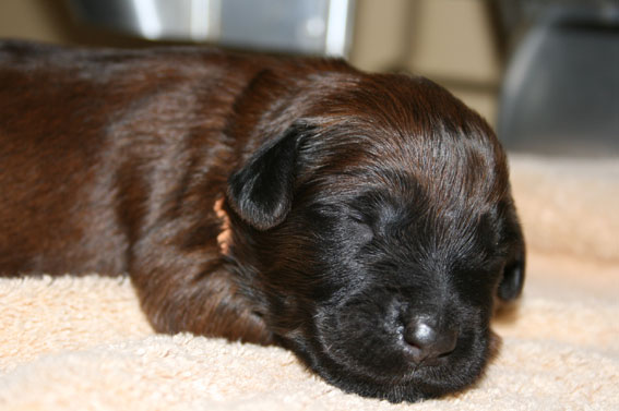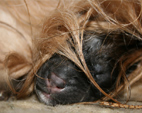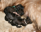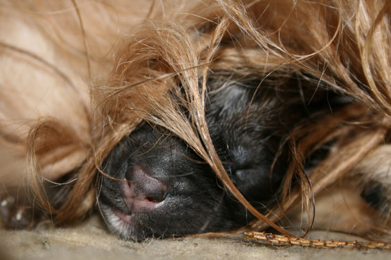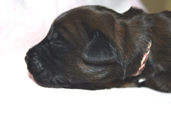 Noch sind Augen und Ohren geschlossen. Die Welpen trinken, schlafen und wachsen und dann trinken, schlafen und wachsen sie weiter. Dabei liegen sie über und untereinander, mal unter der Mama, mal daneben. Man hört es vielstimmig aus der Kiste. Es wird gegrummelt, gemaunzt, geknautscht und gelegentlich entsetzt aufgeschrieen, wenn ein Geschwisterchen allzu rücksichtslos über einen hinweg krabbelt. Schöner als ein Kaminfeuer .....