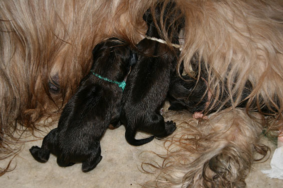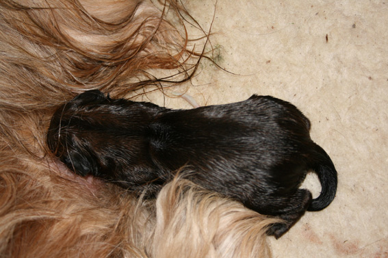 Nach mehr als drei Stunden ging es erst um 17.00 Uhr weiter. Zwei neue Erdenbürger, diesmal Mädels, wurden geboren. Danach kam cirka stündlich ein weiterer Welpe, bis um 20.00 Uhr neun, muntere, kleine Racker hörbar und vielstimmig die Welpenkiste füllten. Es sind fünf stramme Jungs, der Größte mit 480 Gramm, und vier süße Mädels, die Zarteste mit 330 Gramm.