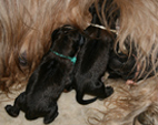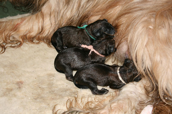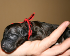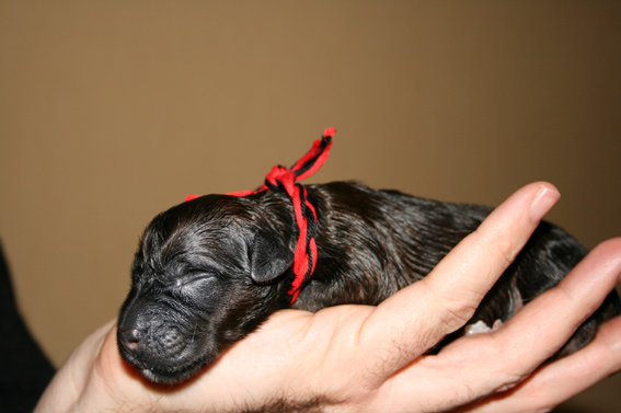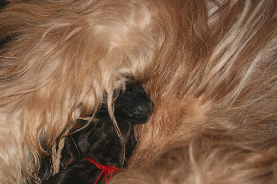 Heute, am errechneten Geburtstermin, hatten wir einen ruhigen, eher ereignislosen Vormittag. Um die Mittagszeit wurde Carreau sehr unruhig und hechelte stark. Es wurde also ernst. Nur noch schnell die Kids aus der Schule abholen und dann konnte die Geburt beginnen. Während der kurzen Autofahrt war Carreau sichtlich unwohl. Wir beeilten uns also nach Haus zu kommen und dennoch beim Aussteigen überraschte sie uns schon mit ihrem ersten Welpen, er lag auf der Fußmatte im Auto. Carreau rannte ins Haus direkt in ihre Wurfkiste. Ich brachte ihr den Welpen, rubbelte und wärmte ihn und mit den ersten Lautäußerungen übernahm sie sehr instinktsicher, ruhig und liebevoll die Betreuung ihres Erstgeborenen.