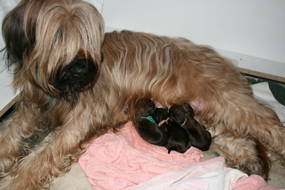 Nach einer Stunde folgten zwei weitere Welpen, ein Mädel und noch ein Junge. Danach ruhte ab 14.00 Uhr die frischgebackene Mama zufrieden mit ihren Welpen in der Kiste. Schlief ein wenig, begutachtete die Welpen, leckte und versorgte sie. Fotos und Videoaufnahmen waren im Kasten. War es das?