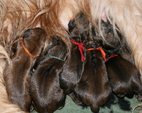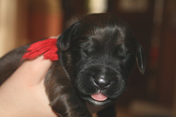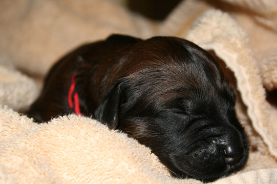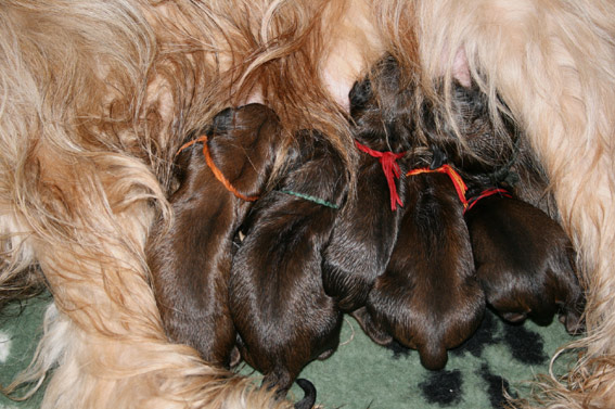 Der Rest der Bande entwickelt sich munter und lässt der Mama kaum mal eine Verschnaufpause. Damit die Welpen auseinander zu halten sind, trägt jedes ein Farbbändchen. Die Welpen wachsen rasant. Die ersten haben ihr Geburtsgewicht zum Ende der Woche verdoppelt. Der Wäschekorb, in den sie regelmäßig umziehen, wenn die Wurfkiste gesäubert wird, ist schon randvoll.
