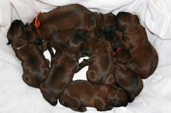 Es war eine sehr schöne, komplikationslose Geburt, die unsere ganze Familie miterlebt und genossen hat. Die frischgebackene Hundemama und die neun Lütten schlafen nun zufrieden. Sie ruhen sich sicherlich für große Taten aus....