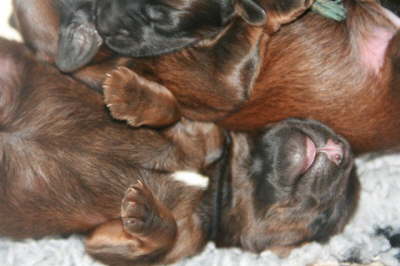 Der Briardwelpe mit dem kleinen, weißen Streifen auf der Brust