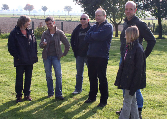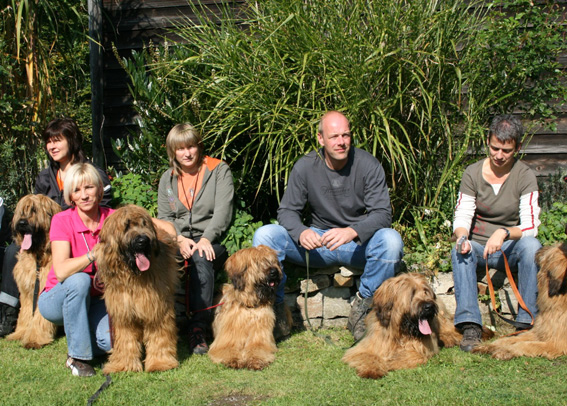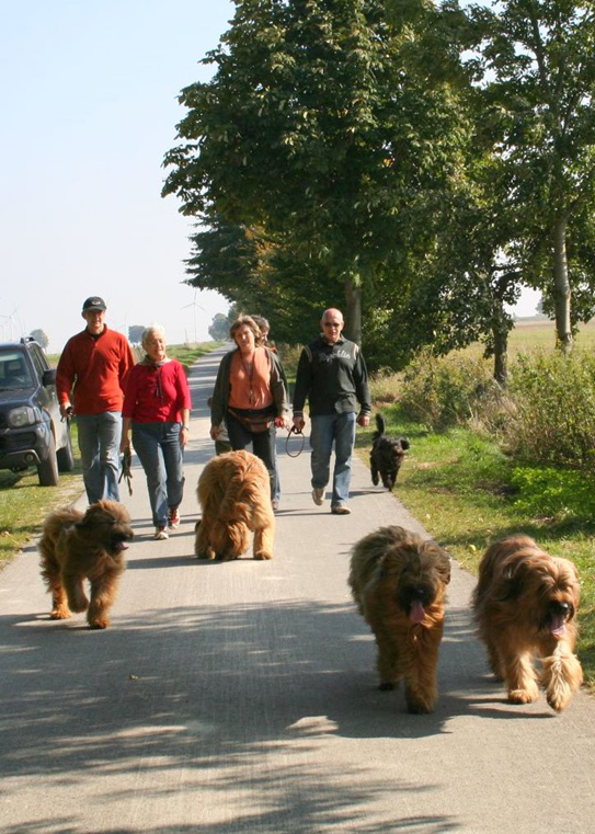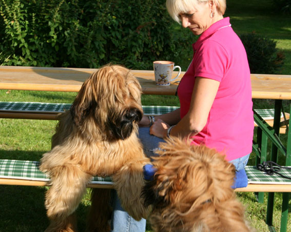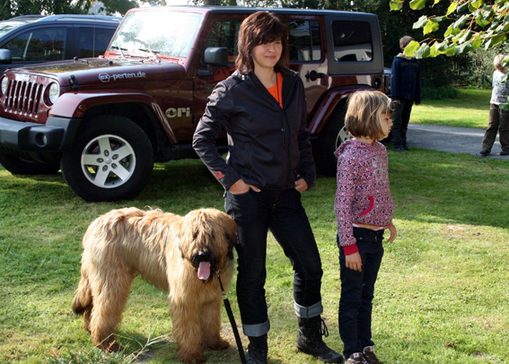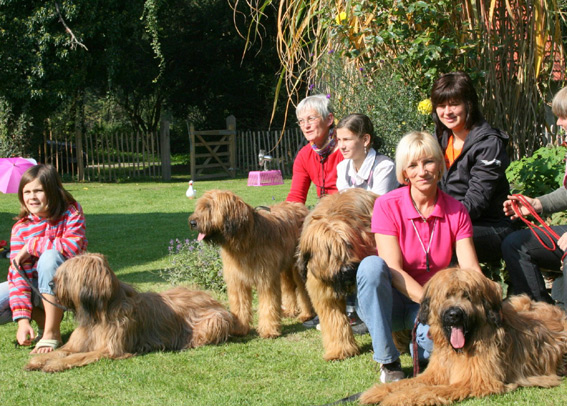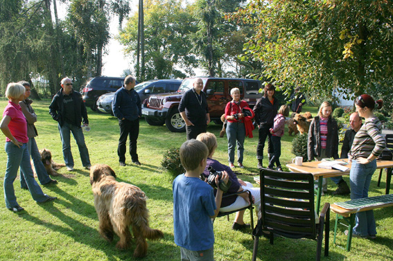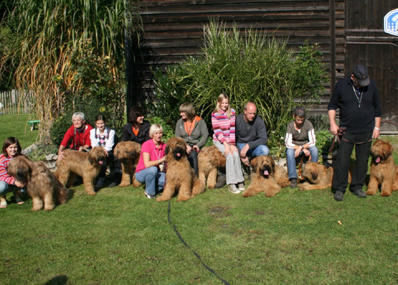 Es hatte die ganze Woche nur geregnet, doch der Sonntag begann -ganz wie gewünscht- mit strahlendem Sonnenschein. Fröhliche Zweibeinern, 21 an der Zahl, und putzmuntere, ausgelassene Briards kamen hinzu. Beim Wurftreffen auf dem Janischhof waren sieben unserer acht A-Wurfgeschwister, inzwischen neun Monate alt, dabei. Es war toll (fast) alle mal wiederzusehen