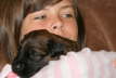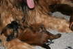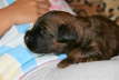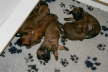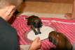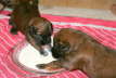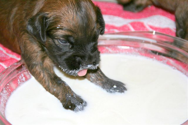 Auch werden sie langsam allein von Mamas Milchbar nicht mehr satt. Sobald die Mama sich blicken lässt, fallen alle Welpen über sie her und saugen gierig, die ersten Zähnchen werden bald durchbrechen…... Es wird Zeit, ihnen was anderes anzubieten. Also gab es den ersten Brei, zunächst noch fast milchig, dann etwas gehaltvoller. Es dauerte ein bisschen, bis sie mit dem Inhalt der Schüssel, was anfangen konnten. Während sich die ersten schon wieder desinteressiert verdrückten, wanderten andere mal hindurch. Über und über mit Breichen eingekleistert, fingen sie an, sich gegenseitig ab zu schlabbern, und kamen auf den Geschmack. Zur weiteren Prägung auf den Menschen gab es Tartar aus der Hand. Zuvor haben jedoch alle ihre erste Wurmkur über sich ergehen lassen müssen. Sie haben erstaunlich gut mitgemacht, obwohl ihnen anzumerken war, dass das Zeug (eine milchähnliche aber pinke Flüssigkeit) wohl wenig schmackhaft sein musste.