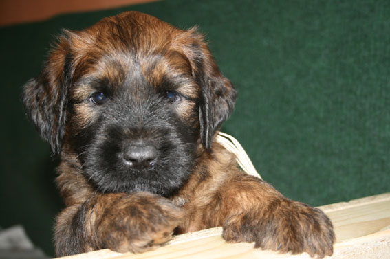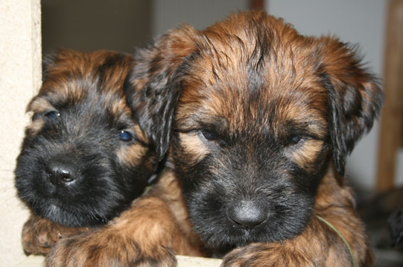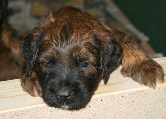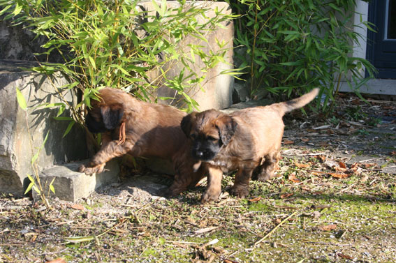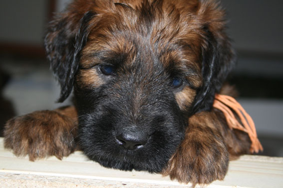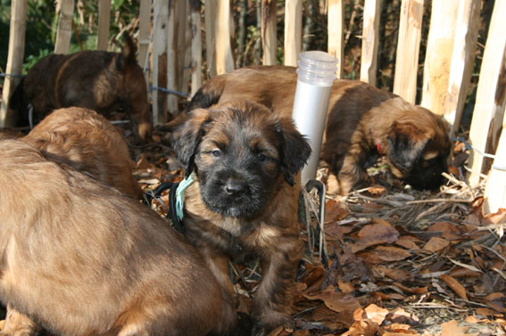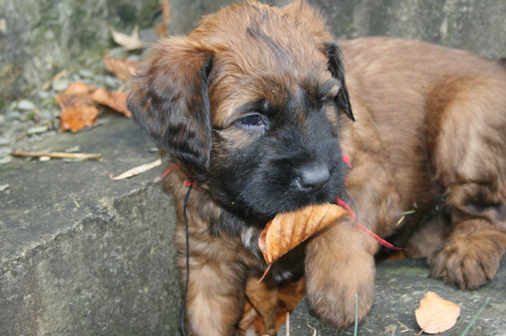 Tatsächlich, die Hundekinder eroberten und entdeckten intensiv ihre Umwelt. Nichts blieb nicht untersucht, die Kreise ihrer Entdeckungsreisen wurden immer größer. Sie wurden nicht müde, den Umgang mit ihren Artgenossen und soziale Verhaltensweisen zu üben. Auch Mama Carreau ließ nun nicht mehr „alles“ durchgehen und nahm sich schon mal „einen zur Brust“. Die betroffenen Briardkinder sahen ganz glücklich aus, wenn sie sich dieser Behandlung wieder entwinden konnten.