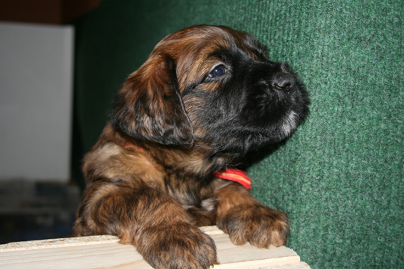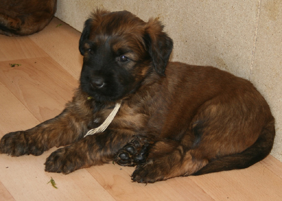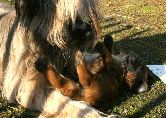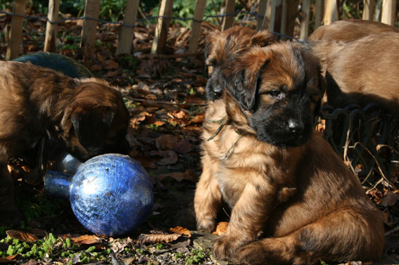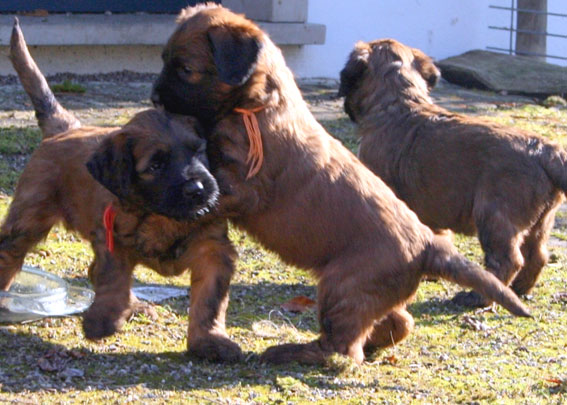Die Welpen übten spielerisch hündische Verhaltensweisen ein: sie zeigten Ansätze von Sexualverhalten, sie unterwarfen einander, gingen auf die Jagd, verteidigten Futter und Platz, oder nur mal ihre Ruhe, apportierten Spielzeug und Knochen. Ihre Rollen wechselten ständig, nur durch intensive Beobachtung –das machen wir natürlich nur zu gern - ist erkennbar, welcher Welpe im Wurf der Chef ist, welcher der intelligenteste, welcher der sportlichste, welcher der gelassenste, welcher der geschickteste ist usw.. Kurzum, wer zu welcher unserer neuen Briard-Familien am besten passen könnte. Dazu sammeln wir jetzt täglich neue Eindrücke.