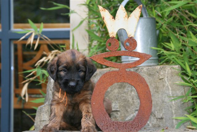 Im Bericht der letzten Woche sind unsere Jungs Blue und B-axelchen ein wenig kurz gekommen, deshalb fangen wir dies Mal mit ihnen an. Vielleicht wäre Blue gern ein Bernhardiner oder Berner Senne geworden? Er ist jedenfalls ein ganz gelassener Geselle, der sich gern heraushält, wenn es mal wilder wird. Dann und wann findet man ihn an einem beschaulichen Plätzchen gemütlich zusammenrollt. Auch am Fressnapf hat er keine Eile, oder die Übersicht? Vielleicht weiß er, dass bei uns westfälisch angerichtet wird: immer reichlich. Vom gehaltvollen Welpenbrei gibt es immer so viel, dass mit Sicherheit eine Portion für Carreau übrig bleibt. Damit soll die Mama bei Kräften bleiben und sie das Säugen der Jungen keine Substanz kosten. B-axelchen hingegen scheint ein richtiger Briard werden zu wollen. Er ist immer mittendrin, mischt gern mit, wenn die Geschwister was anzetteln. Stets ist er dort, wo was los ist. Mit Black-Star verhält es sich ganz ähnlich. Er hat interessanterweise passend zu seinem Nickname viele schwarze Strähnchen im Fell. Ob das den George Clooney-Effekt ausmacht? Besonders zweibeinige Damen finden diesen kleinen, feschen Kerl unwiderstehlich.