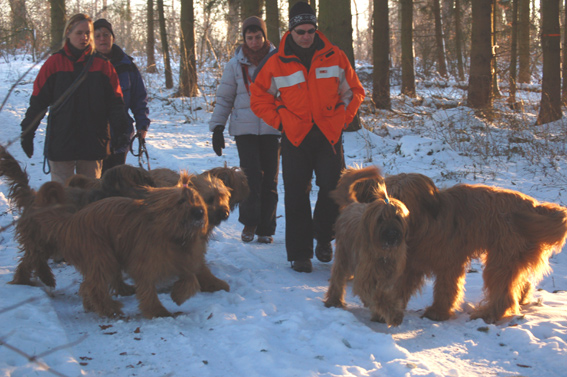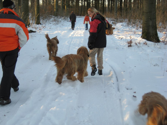 Die anschließende große Geburtstagswanderung durch die im strahlenden Sonnenschein liegenden Felder und Wälder wurde entsprechend eingekürzt. Endlich :-), seufzten einige Zweibeiner unmittelbar vor dem Schockfrost, leider :-( bedauerten insbesondere unsere Briards, die sichtlich Spaß hatten in der Rudelformation. Die waren ja auch richtig "angezogen". Alle tauten dann bei Sekt, Kaffee und Kuchen, heißer Suppe und vielen intensiven Gesprächen rasch auf. Es sollen tatsächlich - bis die Geburtstagskerze heruntergebrannt war - ausgiebig Erfahrungen ausgetauscht worden sein!?